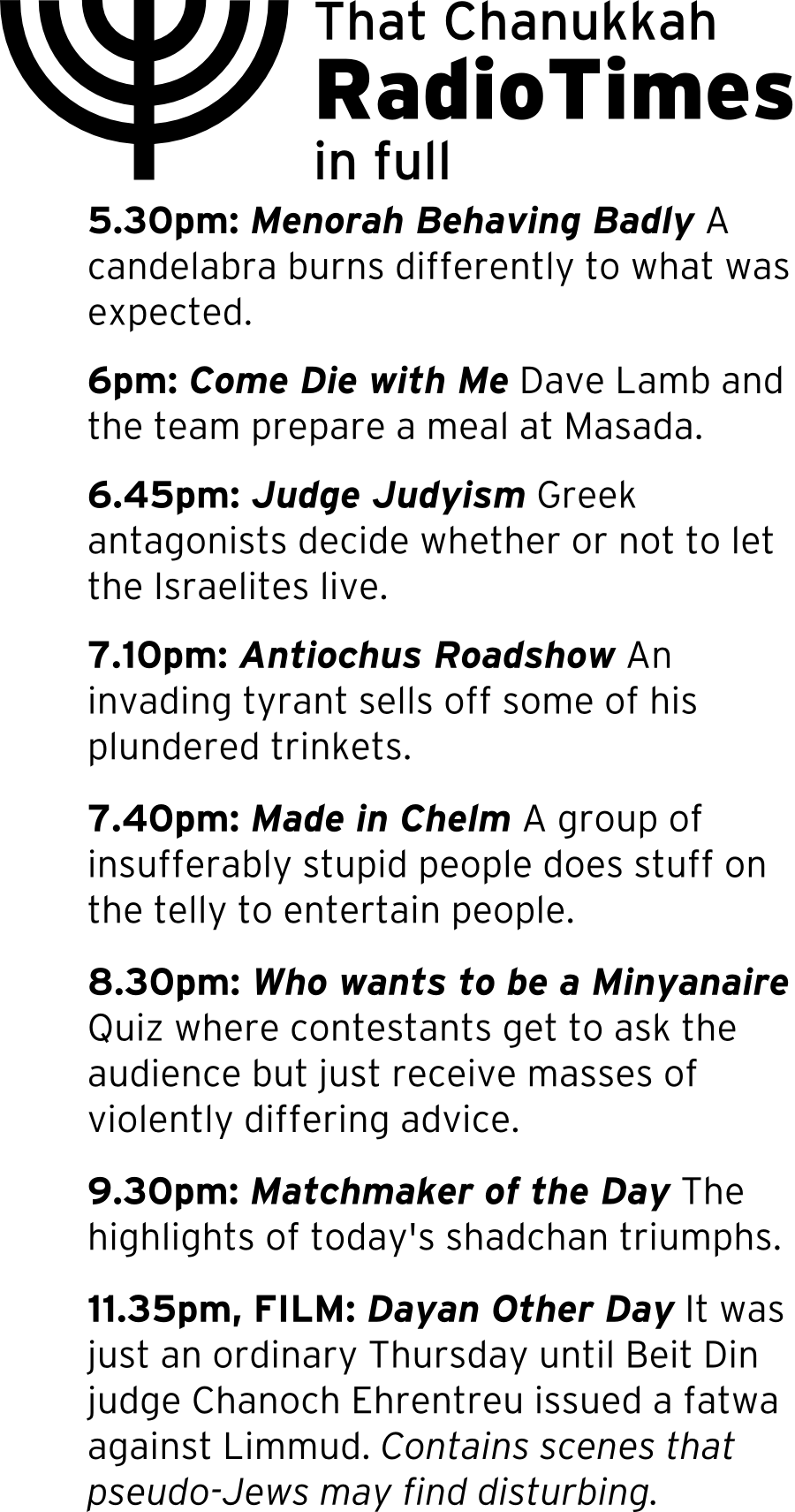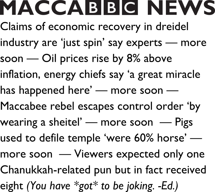 The last November Chanukkah was in the 19th century, so for those who don’t remember that, this year’s early festive approach might have caught you unawares. If so, you’ll appreciate this opportunity to buy some seasonal gifts at knock-down prices all the more.