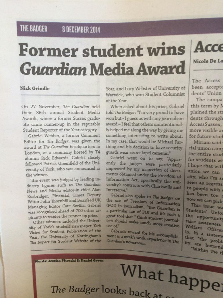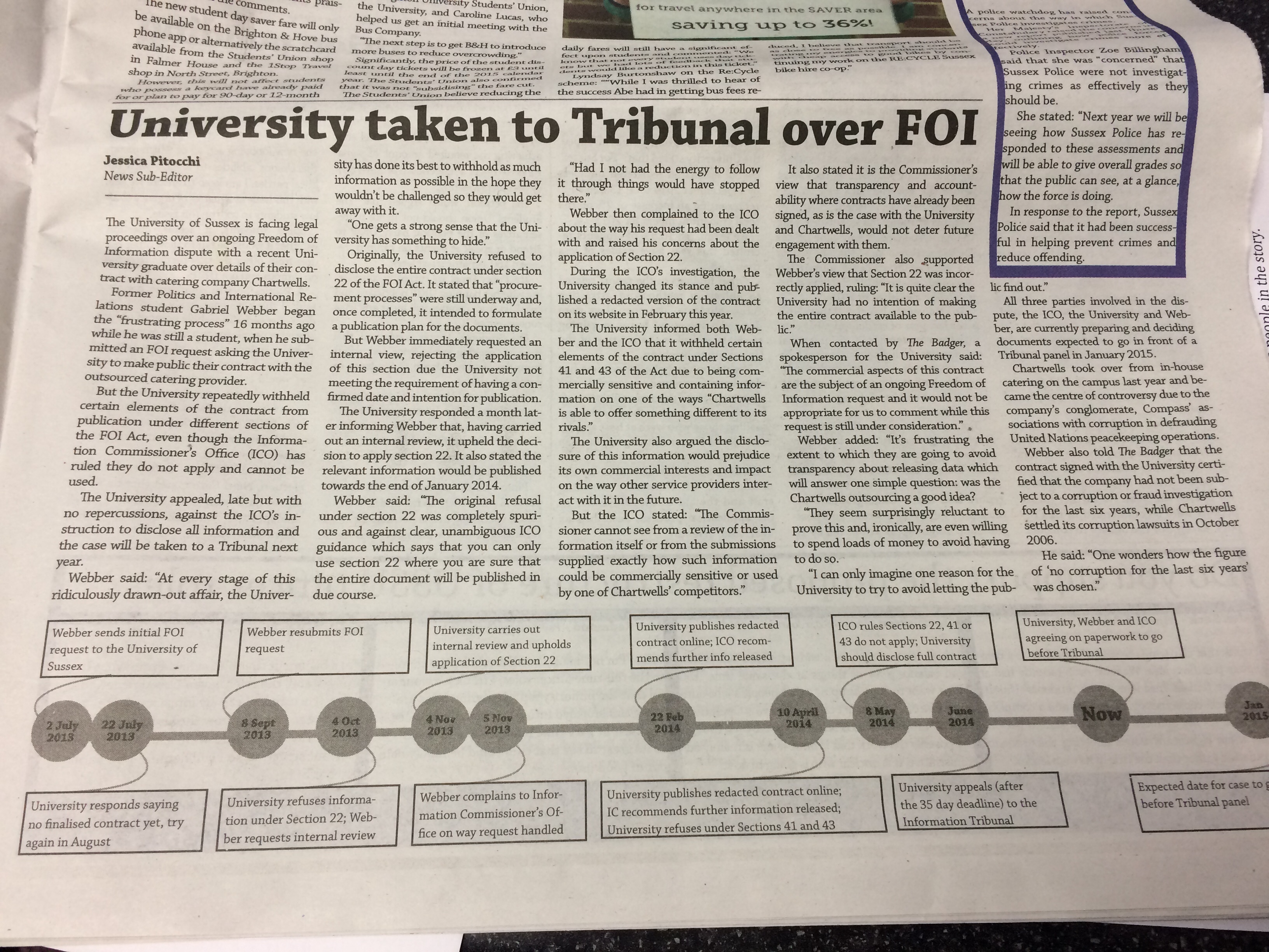 The case of University of Sussex v Information Commissioner and Webber (EA/2014/0148) continues apace. Last week Sussex student newspaper The dear old Badger turned me into an infographic [left]; and yesterday they published an article about my Guardian Runner-up Student Reporter of the Year award for uncovering Lapelgate. (Slightly sad to be so old that I get invited to share my war stories with a young cub reporter.)