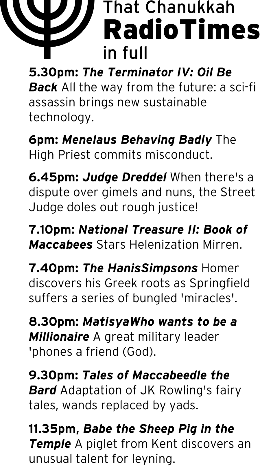 Seasonal TV… (Channukadvent Calendar Day 5) by Gabrielquotes10 December 20155 December 2015Leave a comment Hot off the press: Join us again tomorrow for the next entry in the Channukadvent Calendar! Share this content Click to email a link to a friend (Opens in new window) Email Click to share on Facebook (Opens in new window) Facebook Click to share on X (Opens in new window) X Click to share on Tumblr (Opens in new window) Tumblr Like Loading...