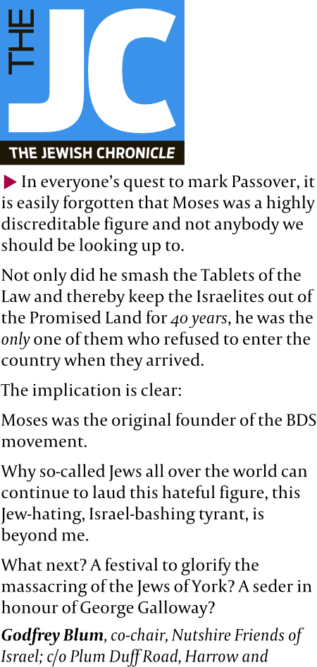 It’s been a helluva 12 months waiting for Pesach to roll round again. The economy remains unrisen. Police sniffer dogs at Manchester Airport have been sniffing out cheese and sausages but have already stopped looking for chametz. And the number of people just across the sea waiting for the waves to part has reached distressingly ridiculous proportions.
