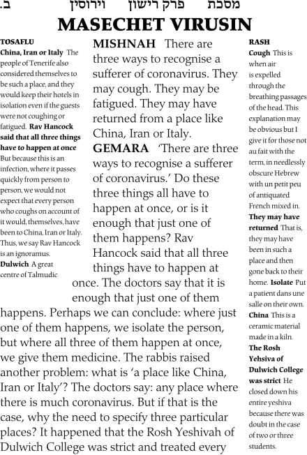 Anyway, as anyone who’s suffered through the Book of Leviticus will know, there’s lots to say about infectious diseases. And fortunately enough, a newly-recovered page from the Hubei Genizah reveals what the rabbis wrote in the lost Talmudic tractate of Virusin. Click below to read!