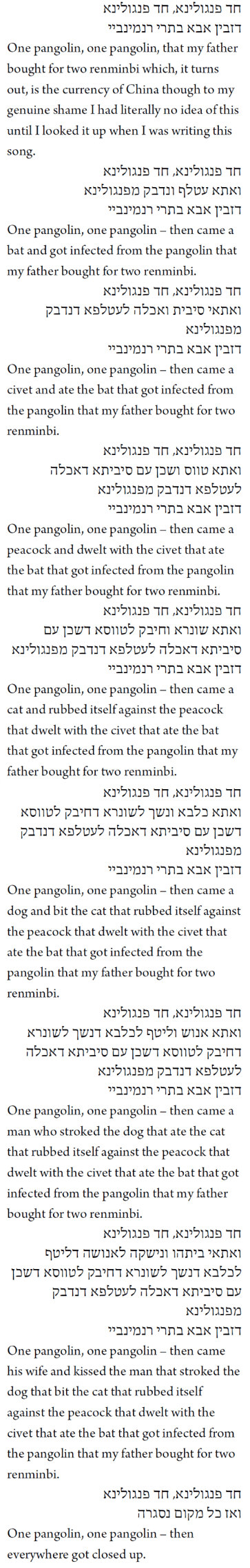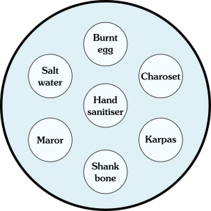 As the seder reaches its height of topical irony, we turn our thoughts to plague, specifically to the ten plagues. As we name each one, we spill a drop of hand sanitiser onto our napkin: