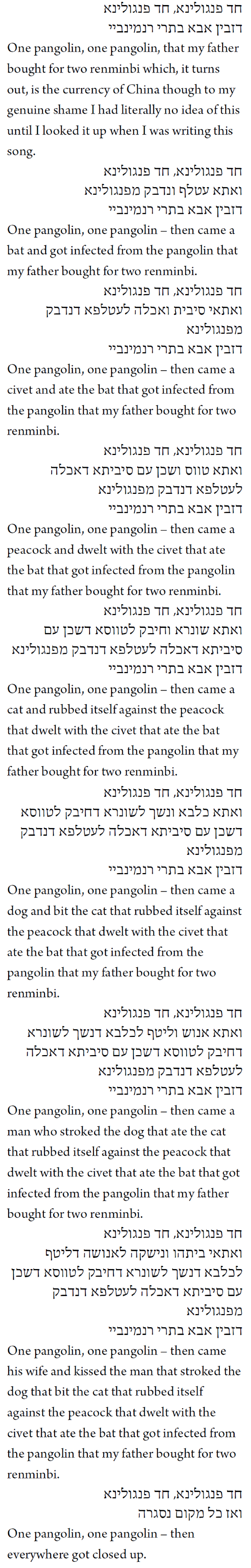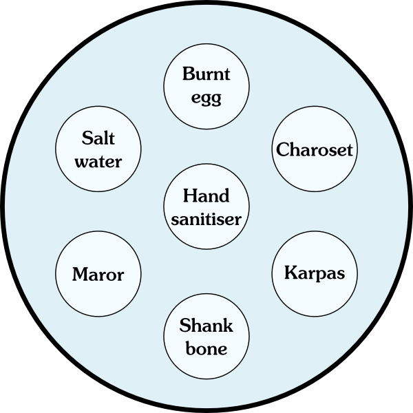 As the seder reaches its height of topical irony, we turn our thoughts to plague, specifically to the ten plagues. As we name each one, we spill a drop of hand sanitiser onto our napkin: